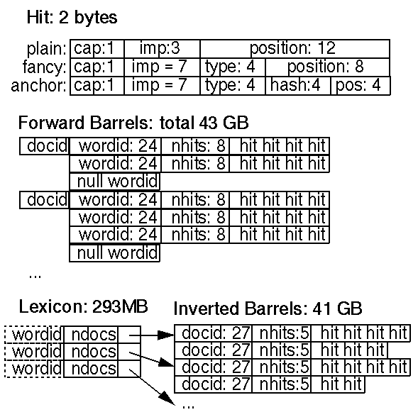 A hit list corresponds to a list of occurrences of a particular word in a particular document including position, font, and capitalization information. Hit lists account for most of the space used in both the forward and the inverted indices. Because of this, it is important to represent them as efficiently as possible. We considered several alternatives for encoding position, font, and capitalization -- simple encoding (a triple of integers), a compact encoding (a hand optimized allocation of bits), and Huffman coding. In the end we chose a hand optimized compact encoding since it required far less space than the simple encoding and far less bit manipulation than Huffman coding. The details of the hits are shown in Figure 3.