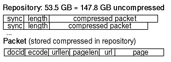 The repository contains the full HTML of every web page. Each page is compressed using zlib (see RFC1950). The choice of compression technique is a tradeoff between speed and compression ratio. We chose zlib's speed over a significant improvement in compression offered by bzip. The compression rate of bzip was approximately 4 to 1 on the repository as compared to zlib's 3 to 1 compression. In the repository, the documents are stored one after the other and are prefixed by docID, length, and URL as can be seen in Figure 2. The repository requires no other data structures to be used in order to access it. This helps with data consistency and makes development much easier; we can rebuild all the other data structures from only the repository and a file which lists crawler errors.